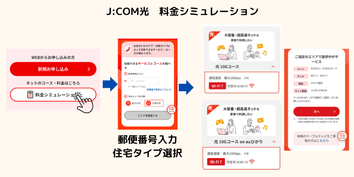 お住まいのエリアで10ギガプランが利用できるか、J:COM公式ホームページで料金シミュレーションをしてみましょう。